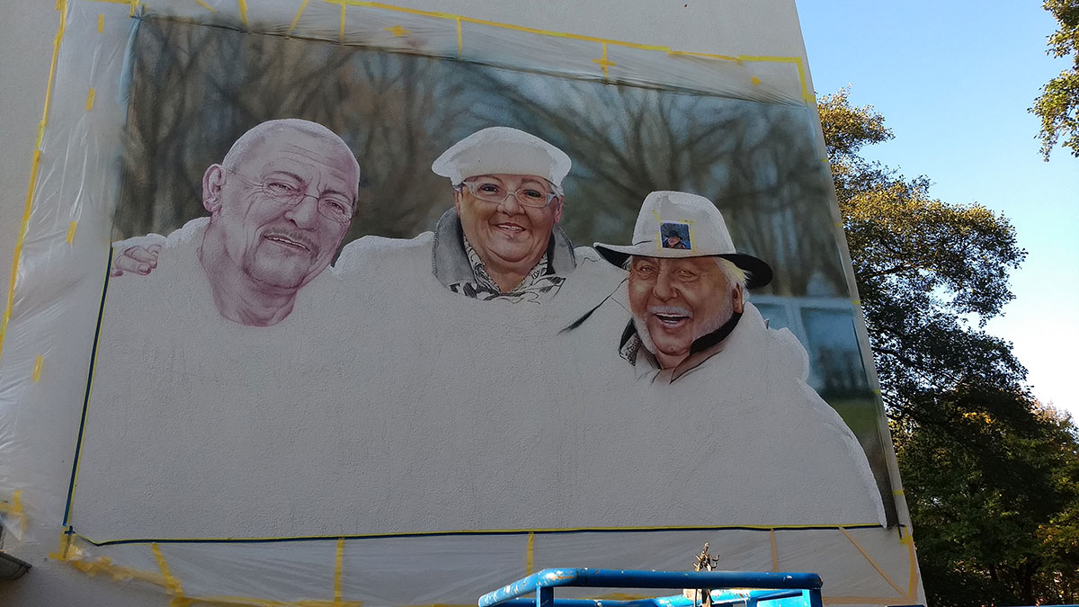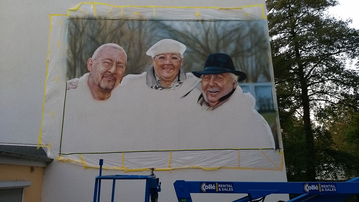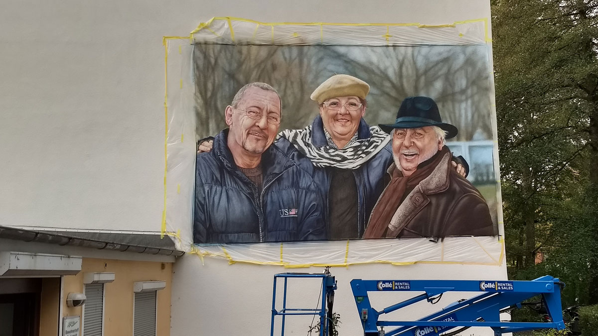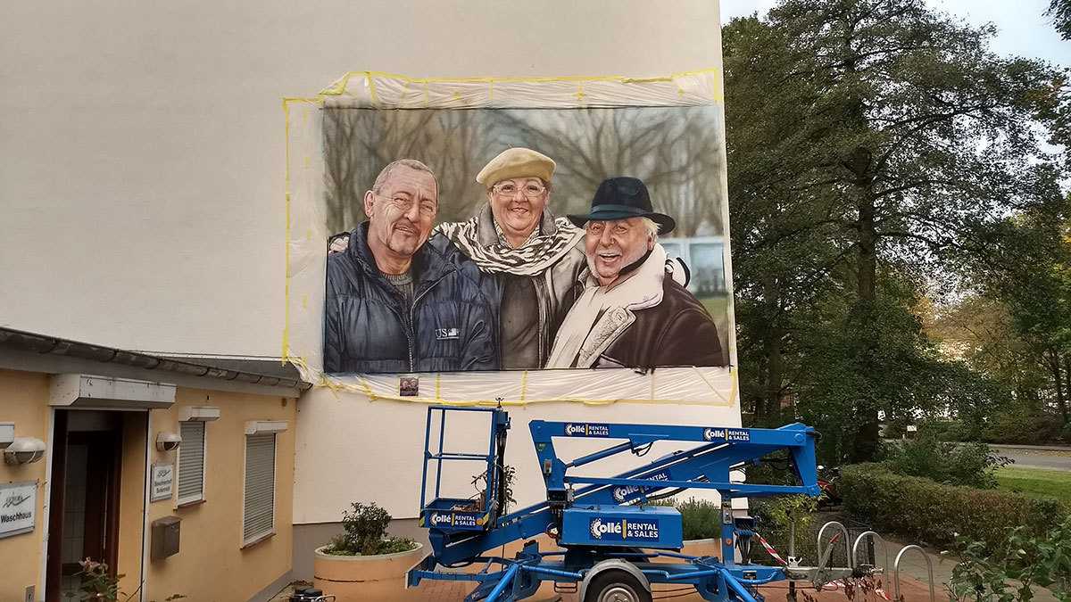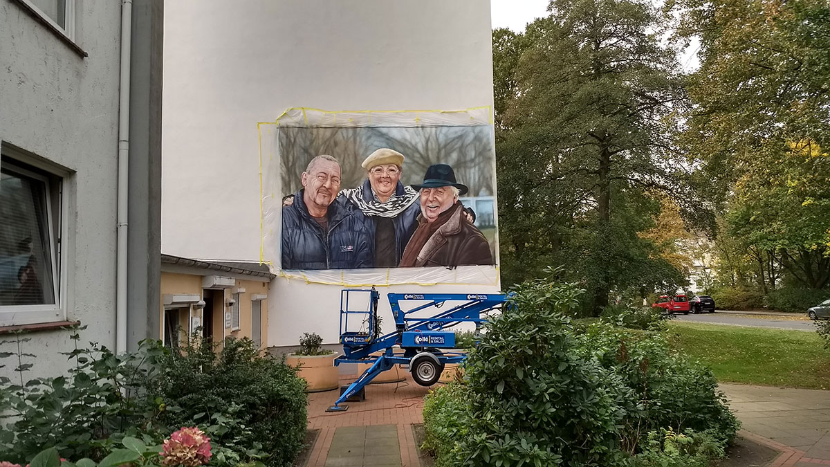 Ein marodes Plakat sollte durch eine Wandmalerei gleichem Inhalts ersetzt werden, es gab also keinerlei Entwurfsarbeit, es wurde nur die künstlerische Umsetzung verlangt. Gar nicht so einfach, auf so einer stark strukturierten Wand…